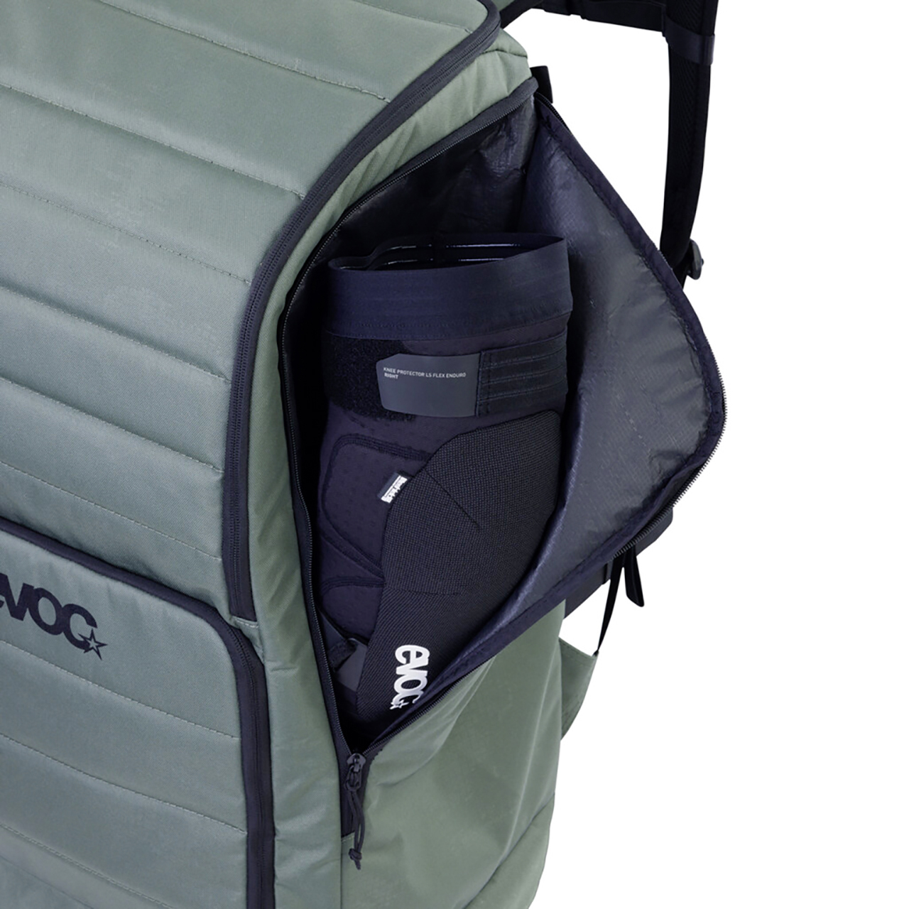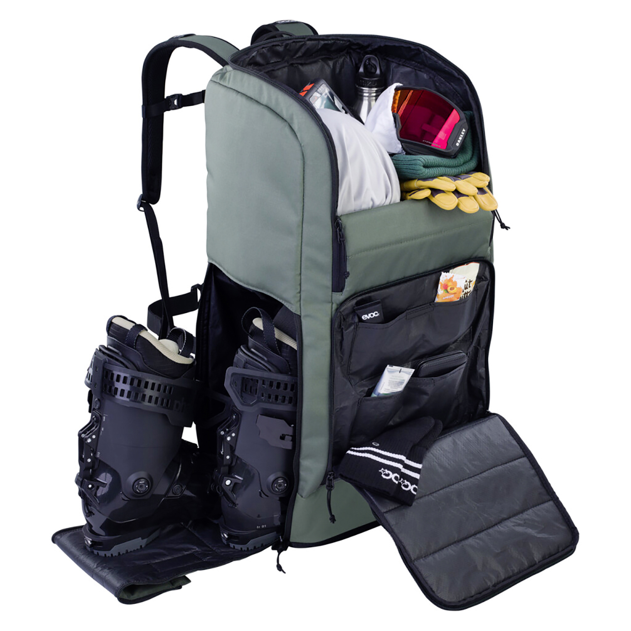 All-in-One Rucksack. In einzelnen, schnell erreichbaren Fächern finden Stiefel, Helm und weitere Ausrüstung kompakt Platz und werden gut geschützt mit auf die Reise genommen.