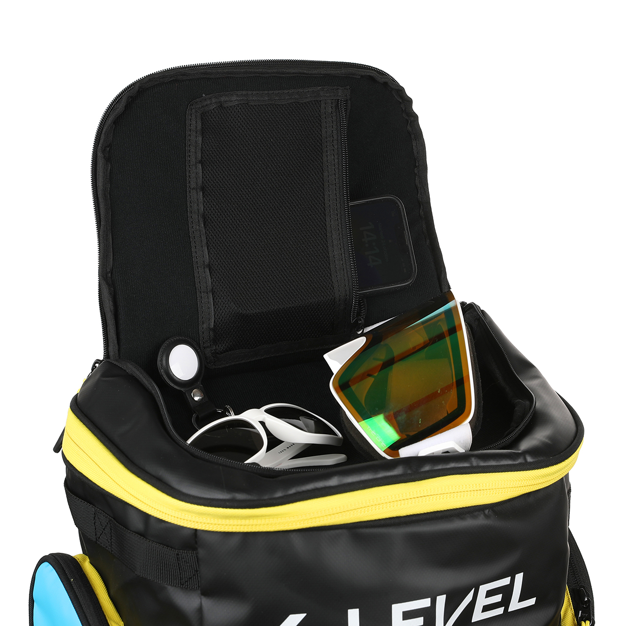 Tasche für Sportler entwickelt, mit zwei bequemen Aussentaschen und zwei wasserdichten Innentaschen unten, um die Stiefel getrennt vom anderen Material zu verstauen. Die Haupttasche ist mit einem Separator für zerbrechliche Gegenstände und einer Reissverschlusstasche für wichtige Gegenstände wie Schlüssel usw. ausgestattet. Der Boden der Tasche ist aus einem wasserdichten und widerstandsfähigen Stoff mit einigen äusseren Gummiteilen zum Schutz. Versteckter Regenschutz in der Bodentasche.